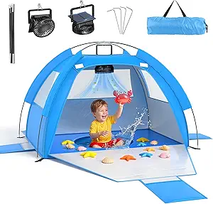 Baby Beach Tent Solar Cooling Fan, Anti-UV Toddler Beach Tent Sun Shelter Portable Travel Fan Beach Shade Tent